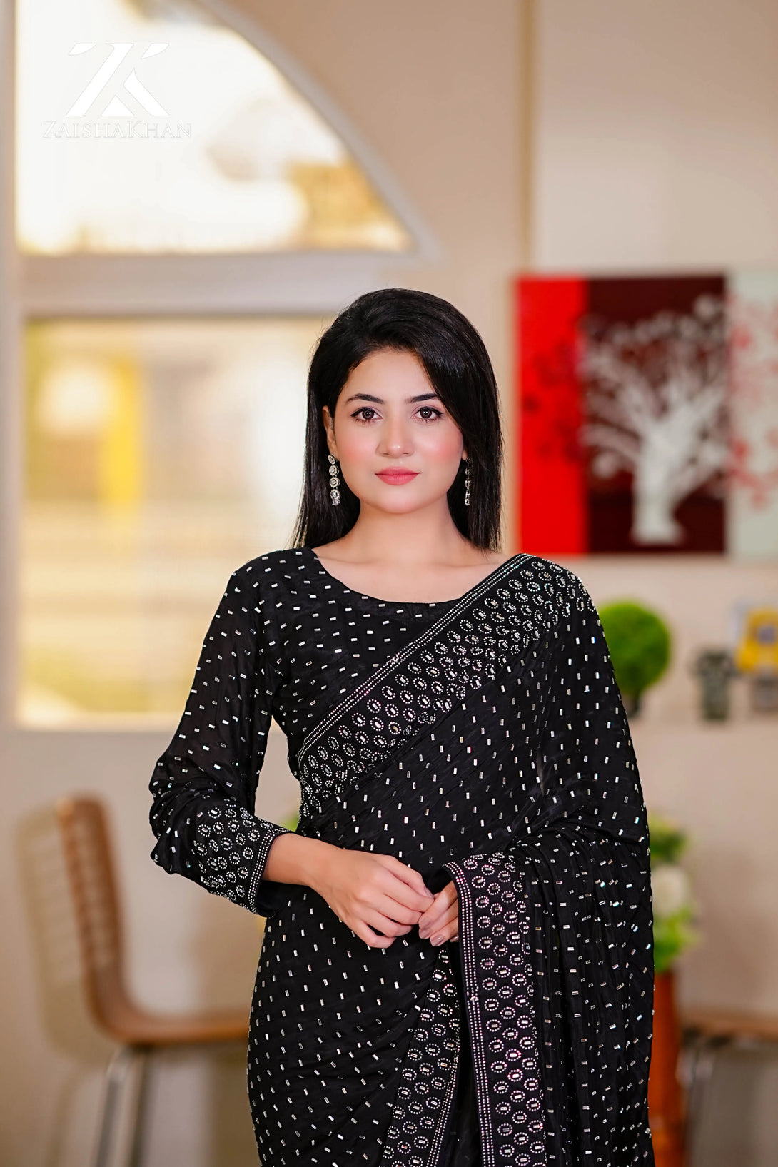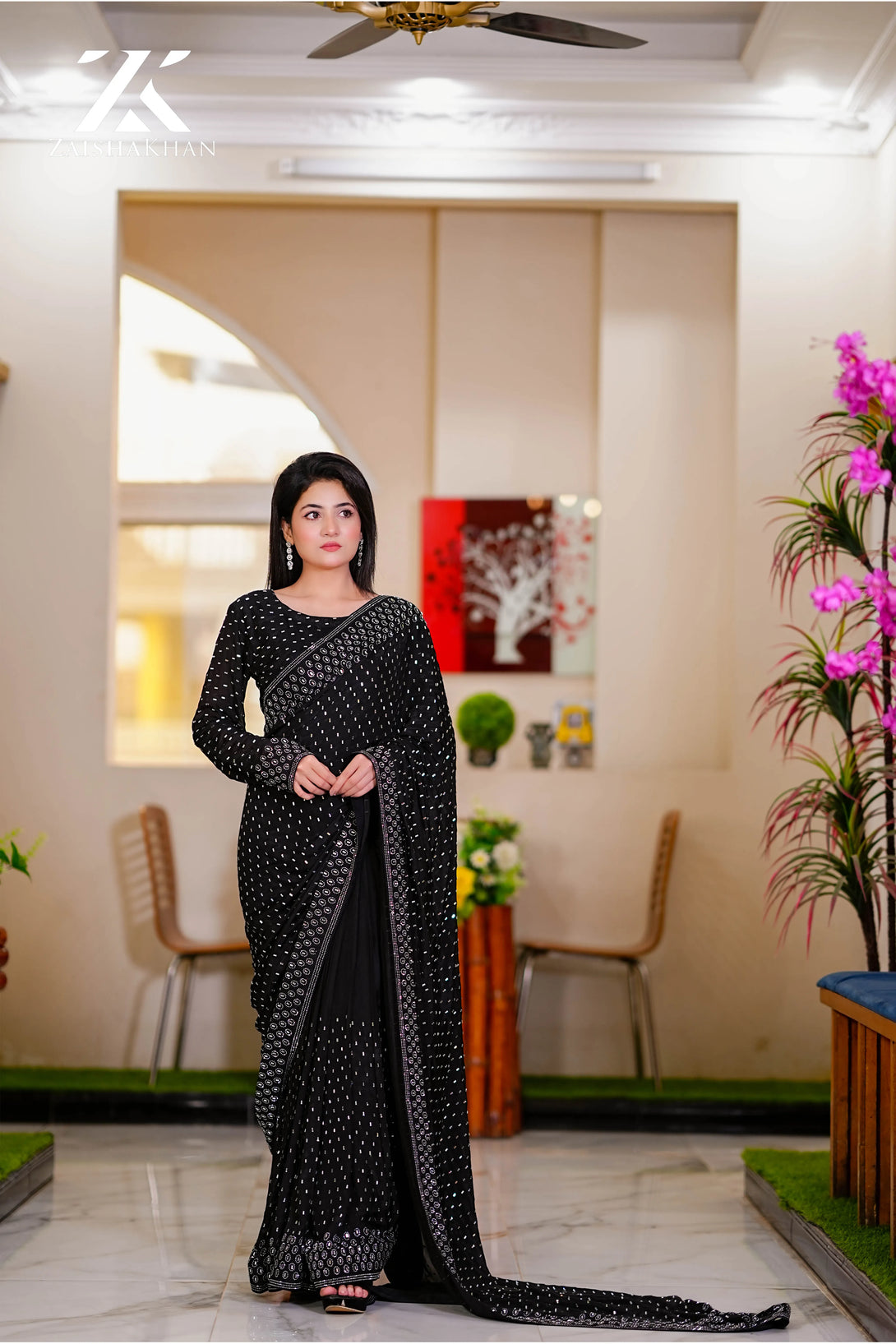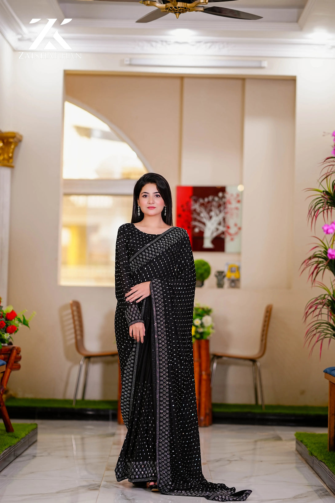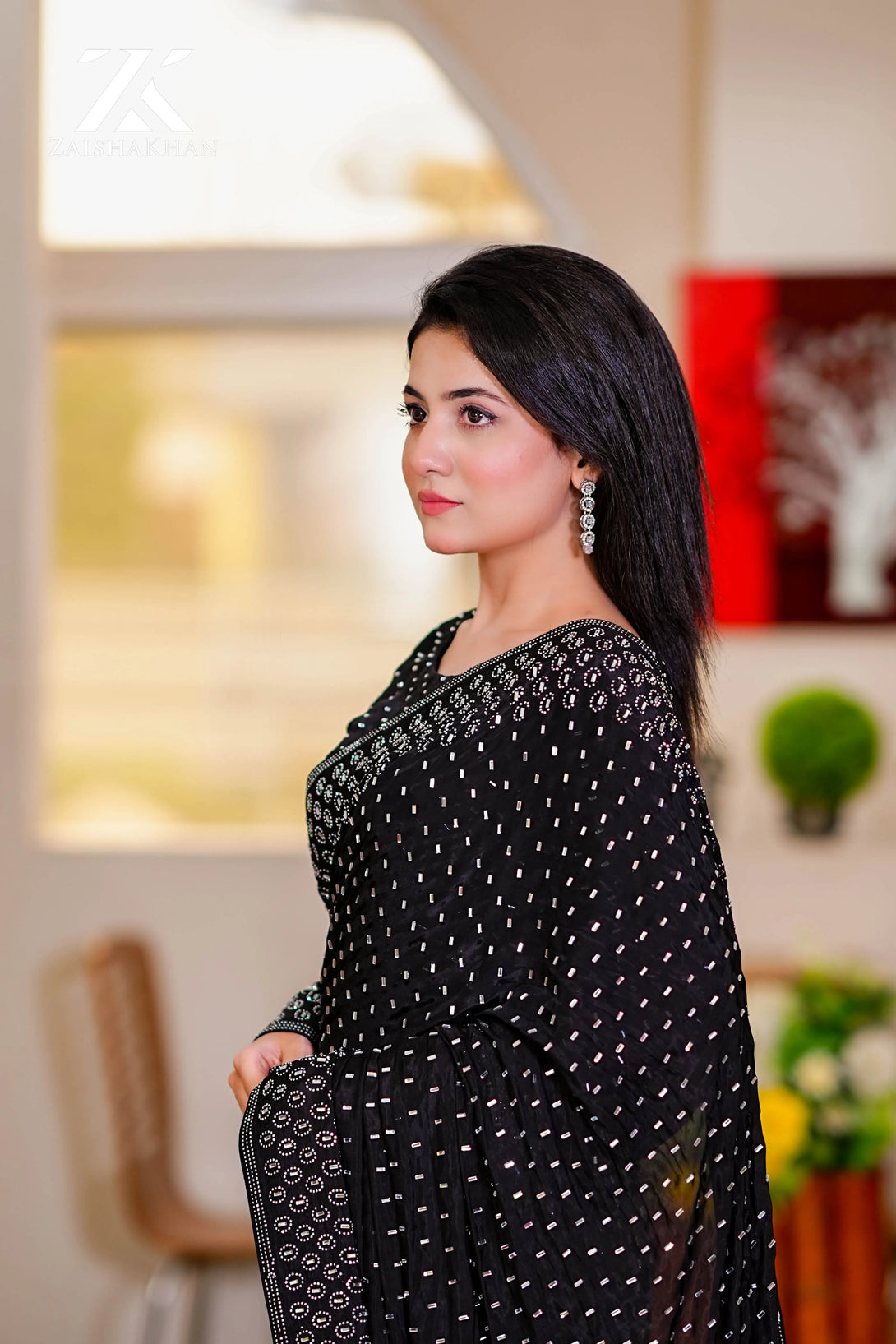 Step into radiant glamour with the Black All Over Crystals Saree ZK-0017, a masterpiece designed for unforgettable evenings. Crafted in a deep black shade, this saree is made from pure medium silk and lavishly adorned with silver glass stones all over, creating a dazzling sparkle that catches every eye. The matching blouse fabric in pure medium silk enhances the saree’s refined and luxurious appeal.