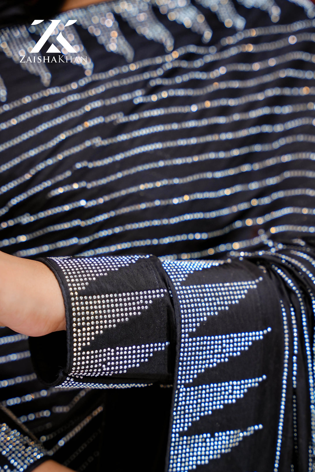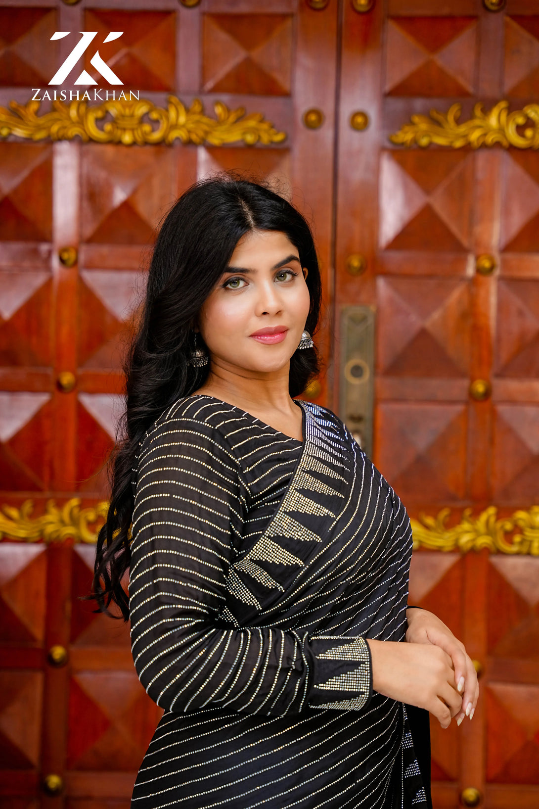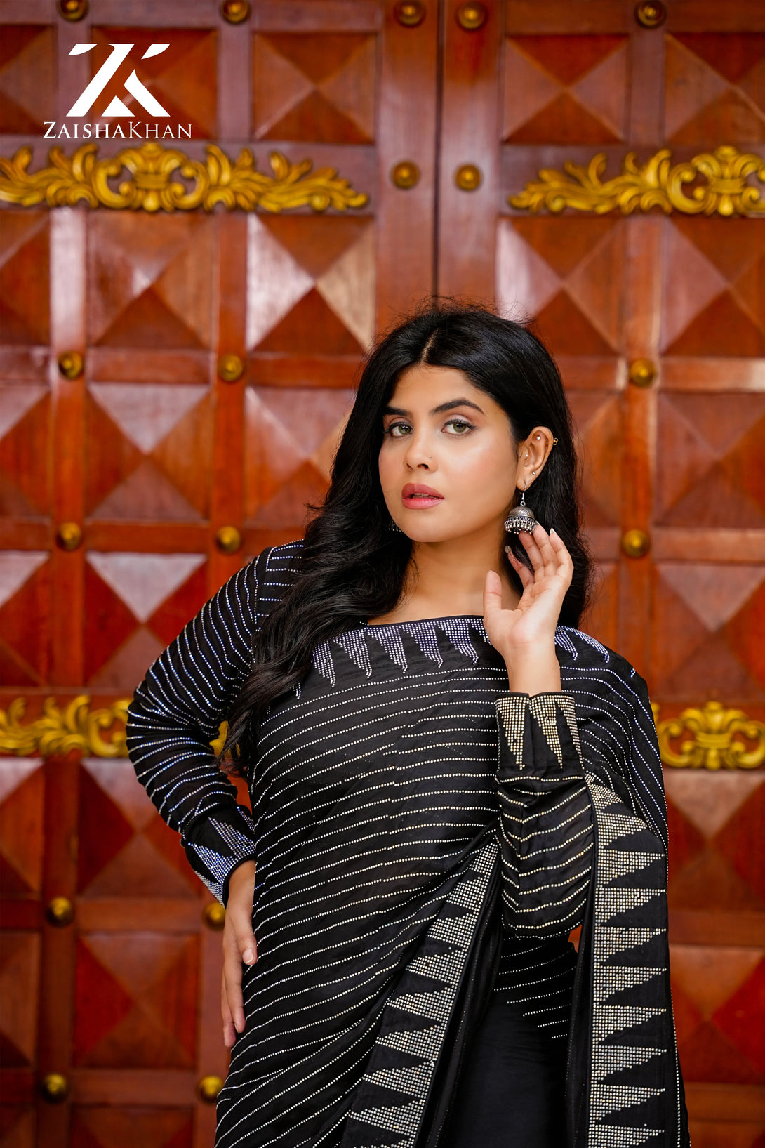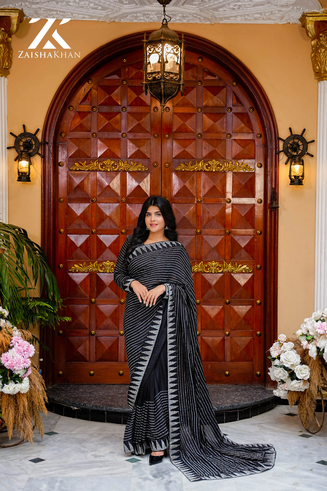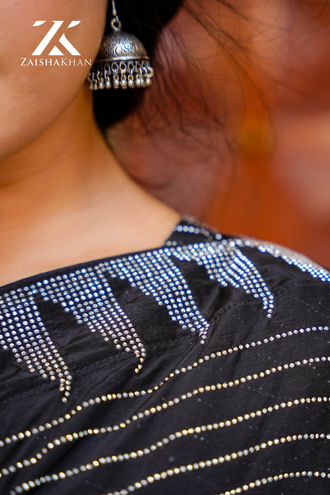 Step into dazzling sophistication with the Black Silver Striped Rhinestones Saree ZK-0019, a showpiece of elegance and glamour. Draped in a timeless black shade, this saree is crafted from pure medium silk and highlighted with shimmering rhinestones and crystal stripes that sparkle beautifully with every movement. The blouse fabric in pure medium silk completes the ensemble with a refined and polished look.