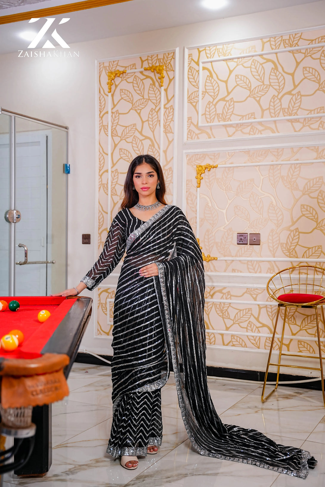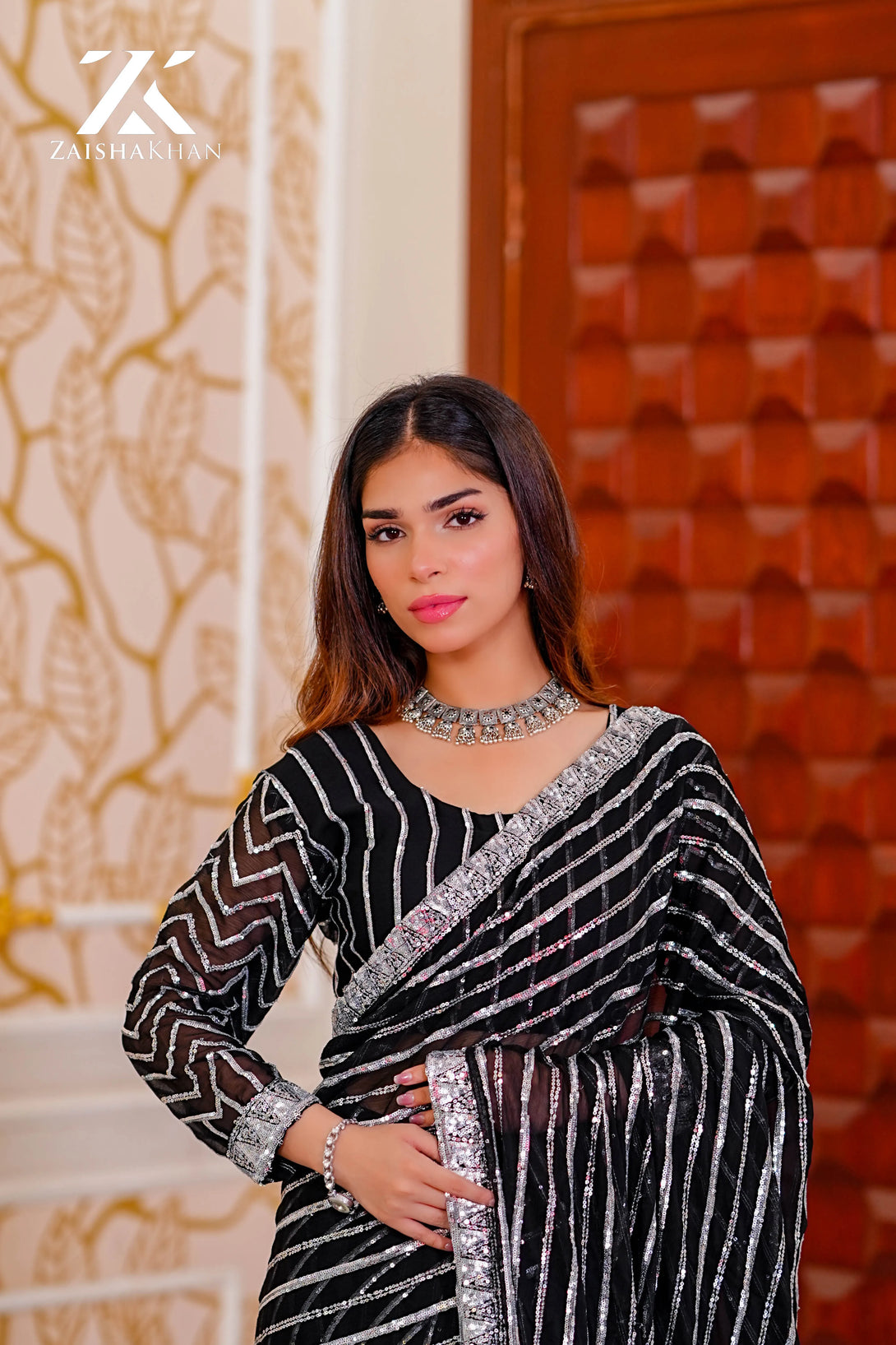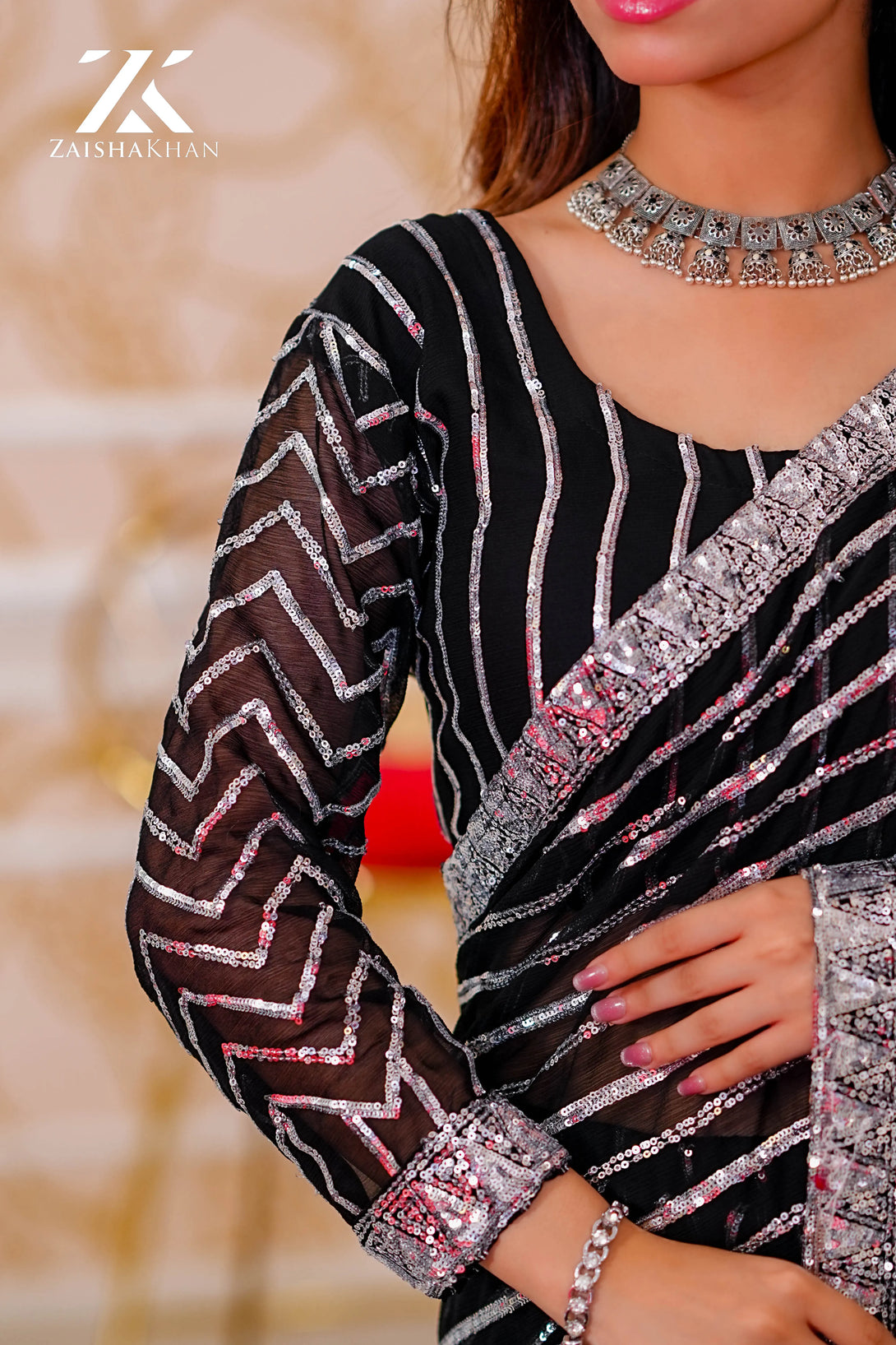 Step into dazzling elegance with the Black Silver Sequins Saree ZK-0016, a show-stopping design for glamorous occasions. Draped in rich black, this saree is crafted from pure medium silk and adorned with intricate silver sequins embroidery that shimmers beautifully with every movement. The premium blouse fabric in pure medium silk adds a polished finishing touch.