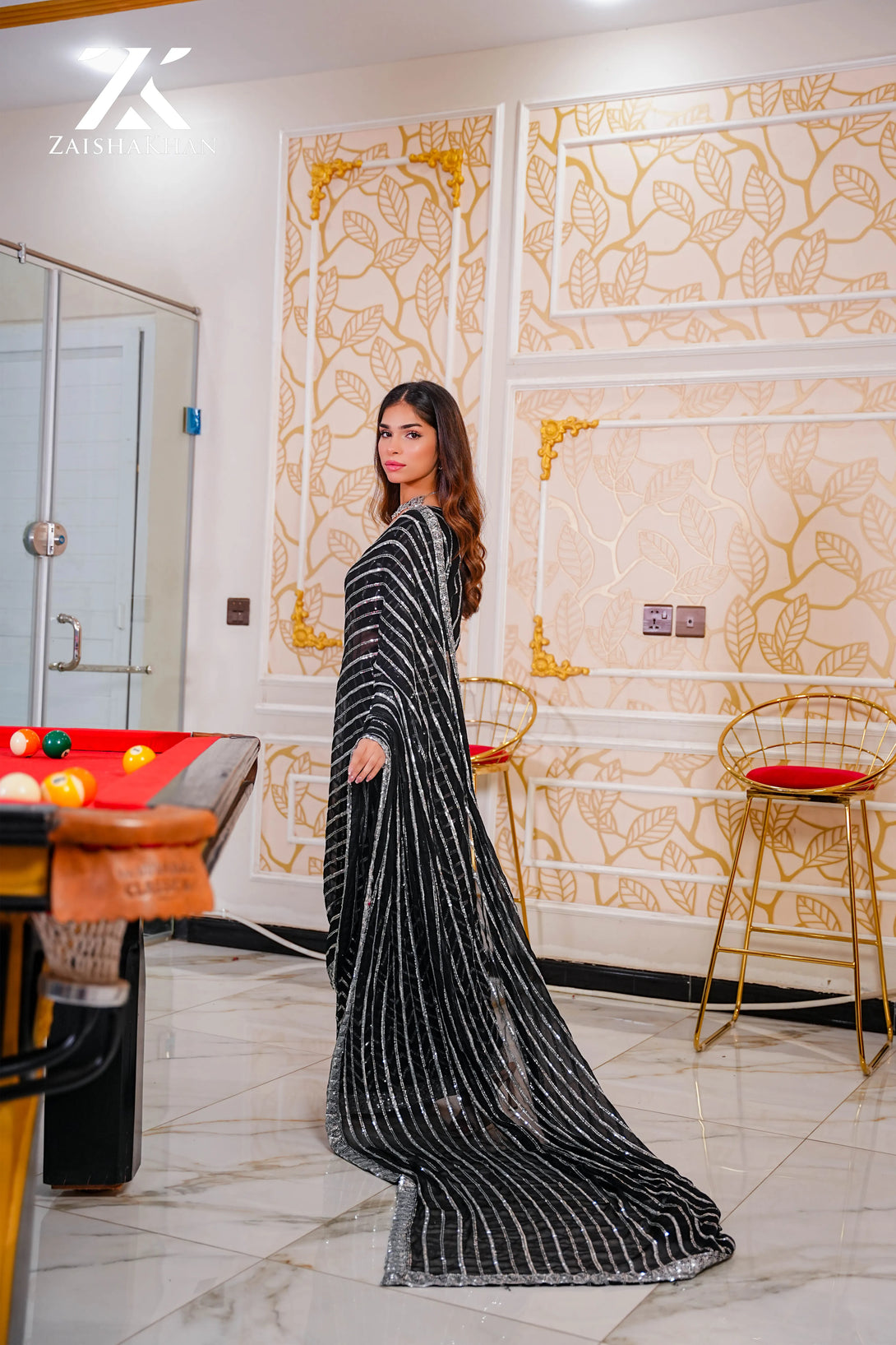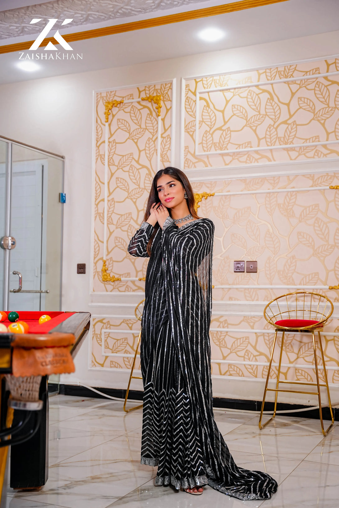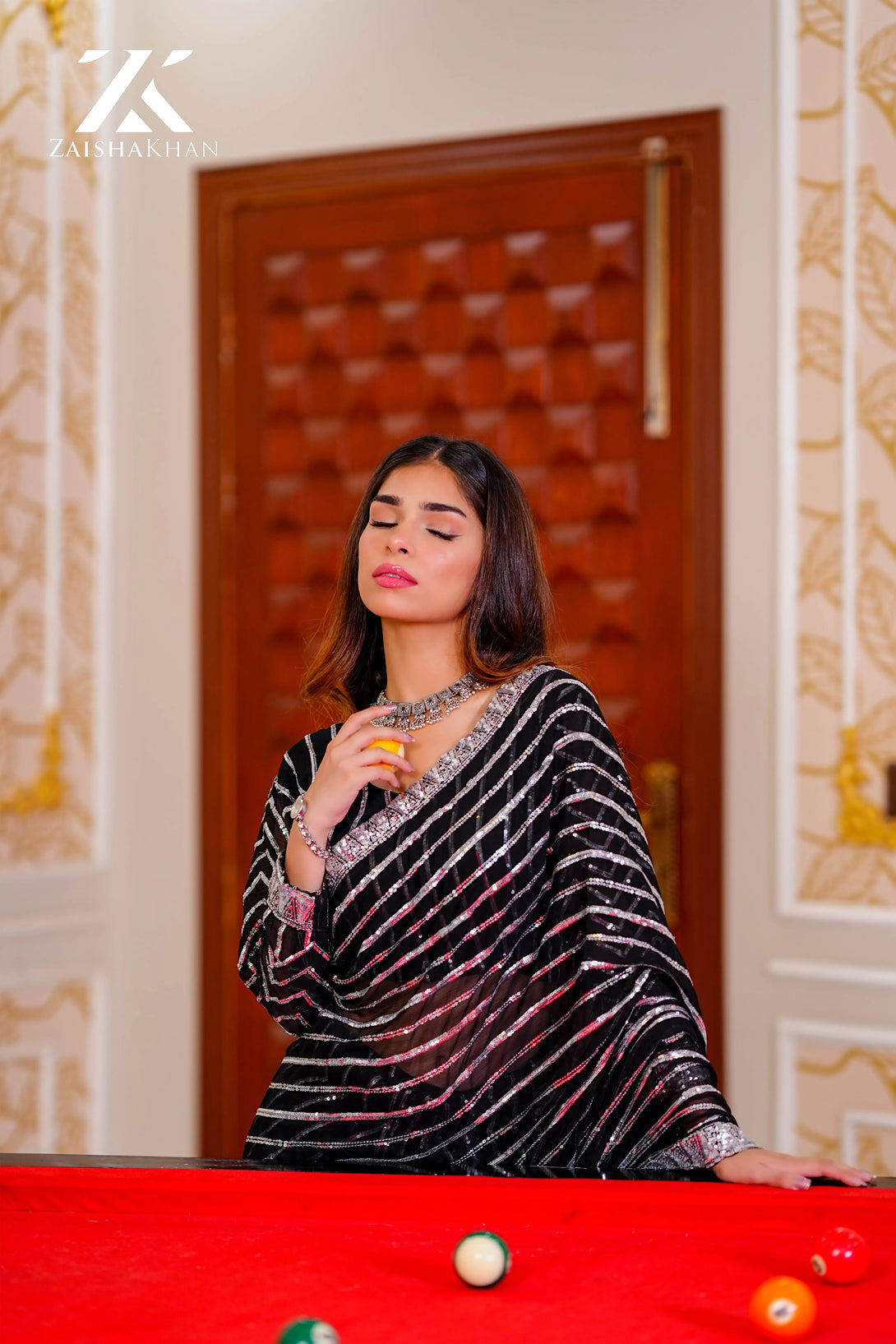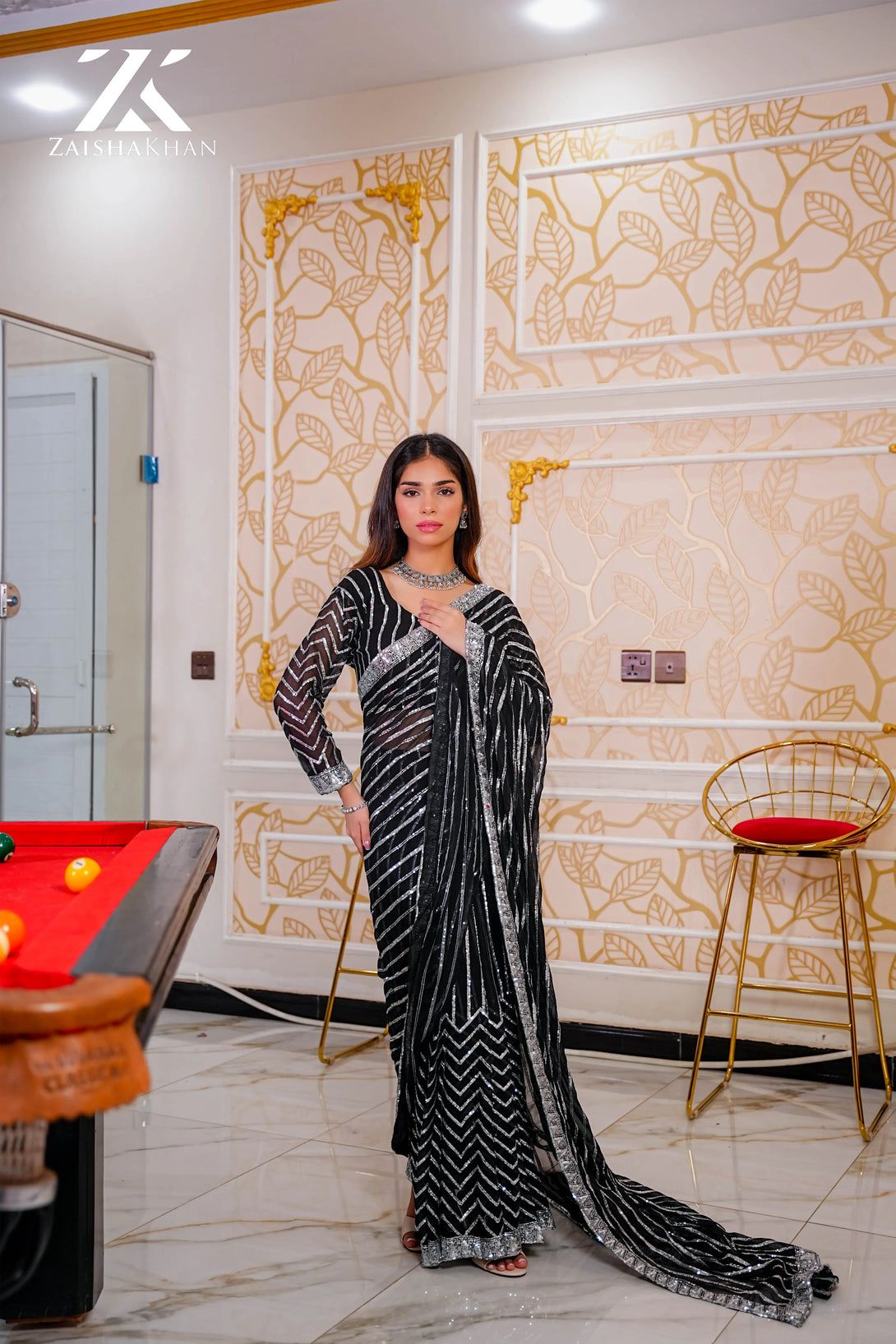 Step into dazzling elegance with the Black Silver Sequins Saree ZK-0016, a show-stopping design for glamorous occasions. Draped in rich black, this saree is crafted from pure medium silk and adorned with intricate silver sequins embroidery that shimmers beautifully with every movement. The premium blouse fabric in pure medium silk adds a polished finishing touch.